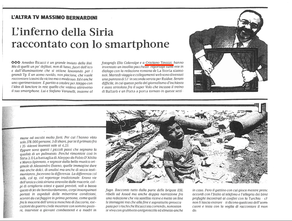 - 2013 Rai – Raistoria ‘Siria 2.0: la battaglia di Aleppo’ Images, coauthor